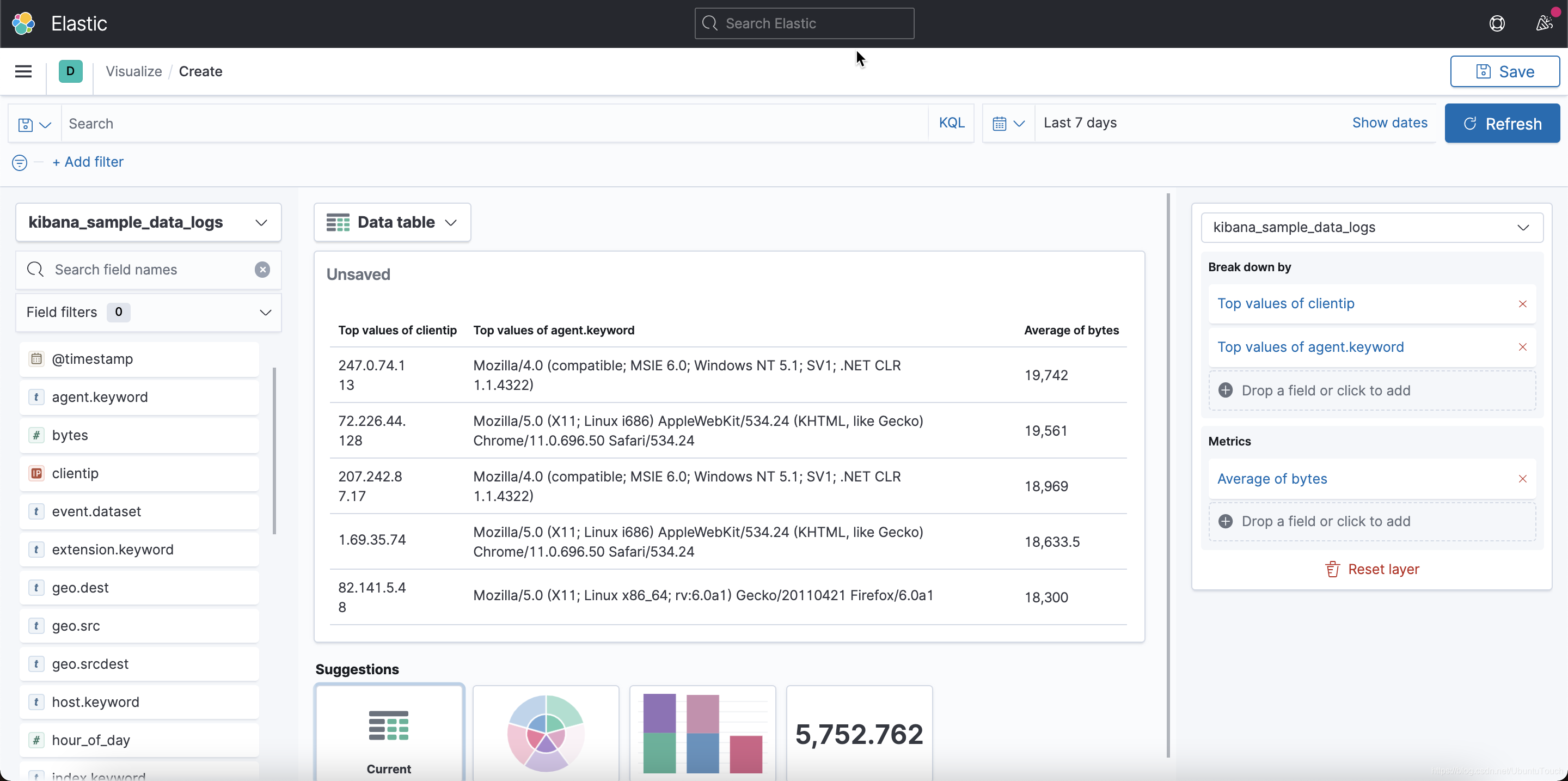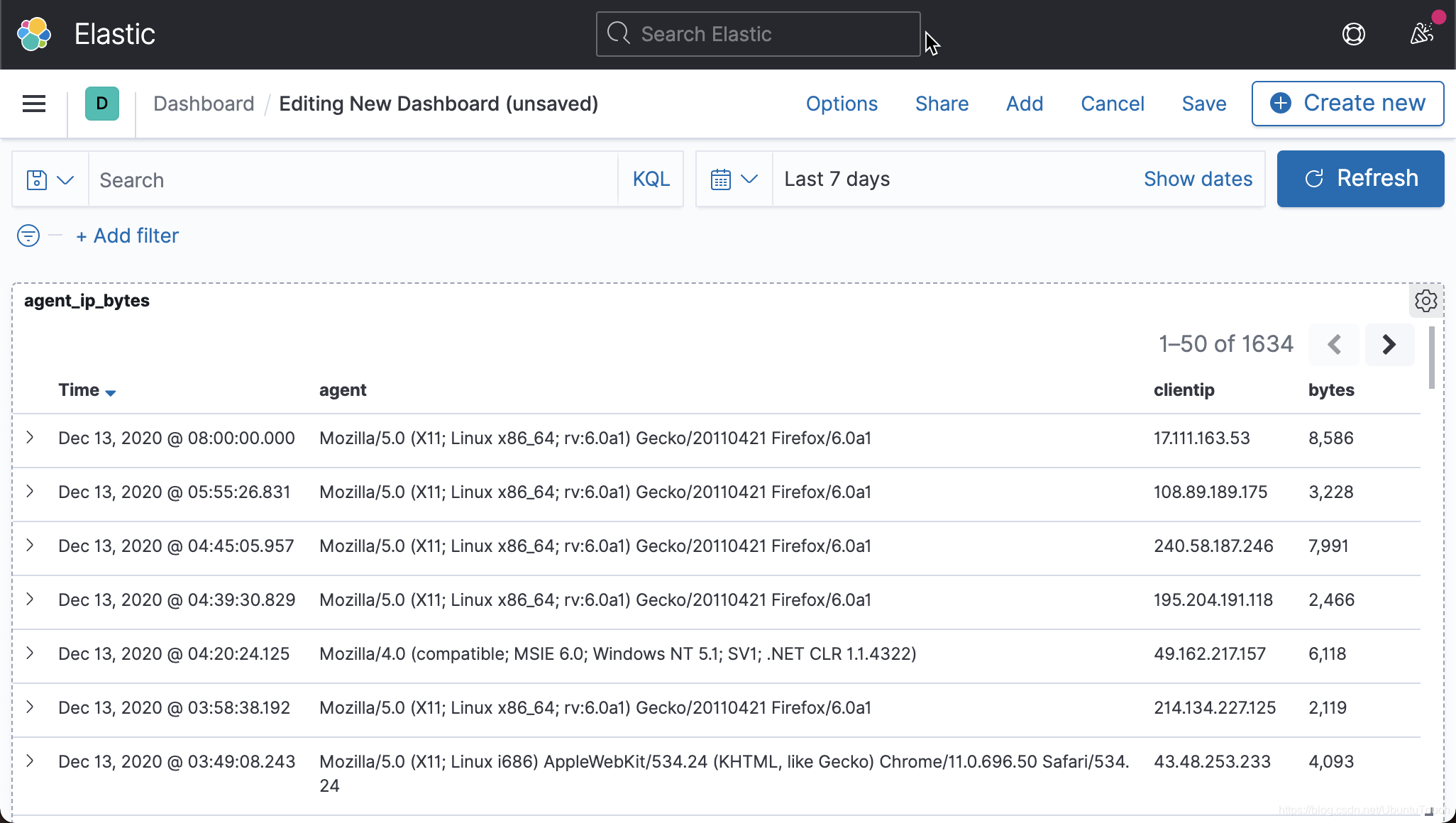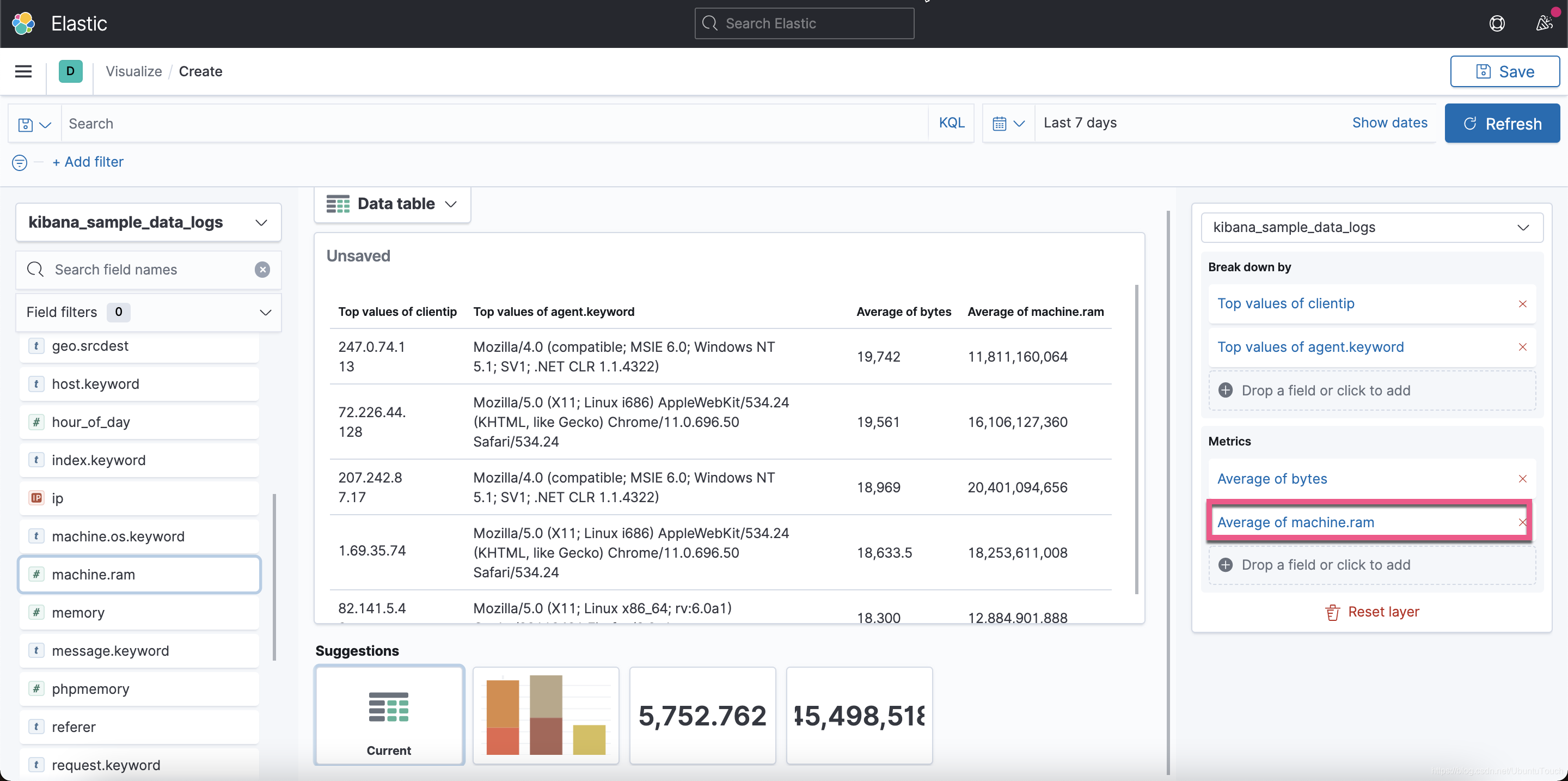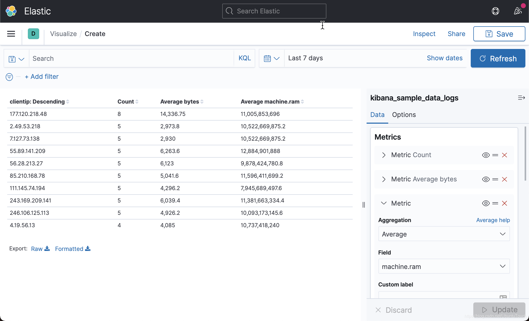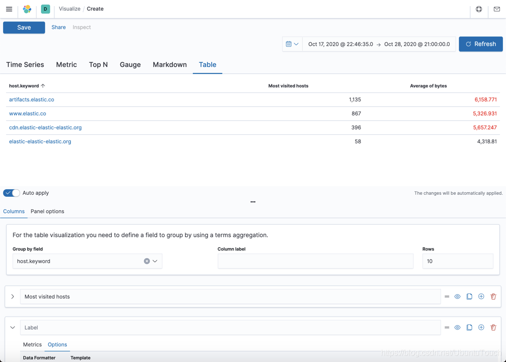 > 本文由 [简悦 SimpRead](http://ksria.com/simpread/) 转码, 原文地址 [blog.csdn.net](https://blog.csdn.net/UbuntuTouch/article/details/111088189) 在 Kibana 的[可视化](https://so.csdn.net/so/search?q=%E5%8F%AF%E8%A7%86%E5%8C%96&spm=1001.2101.3001.7020)中,我们经常会绘制表格。我总结了一下,有如下的四种方法: 1. 在 Discover 界面中制作 2. 使用 table 可视化进行制作 3. 使用 TSVB 来制作 4. 使用 Lens 进行制作 在这几种方式中,几种制作最后的结果是不一样的。我们在实际的使用中,需要根据自己的需求来分别进行选择。 准备数据 ==== 在今天的实验中,我将使用 Kibana 自带的数据来进行演示。我将以 Elastic Stack 7.10 来进行展示:    这样我们就完成了一个叫做 kibana_sample_data_logs 的索引导入。在接下来的练习中,我们将使用这个索引来进行展示。 使用 Discover 界面来制作 table ======================= 我们先打开 Kibana discover 界面:   我们选择 kibana_sample_data_logs 索引模式,然后选择相应的时间 time picker 来展示数据。我们在左边选择相应的字段:  按照同样的方法,我们添加其它的字段,比如 clientip, bytes 以及 agent。最终我们形成如下的表格:  我们点击上面的 Save 链接,并保存当前的可视化图。  我们可以从上面表格中可以看出来:在表格的左边有一个时间戳,我们甚至可以直接点击 **>** 来进行展开这个文档的细节:  这类的表格在 Dashboard 中可以帮我们查找每个文档的详细的内容。我们也可以突出相应的字段在表格中。这个表格最终可以被 Dashboard 所使用:     从上面,我们可以看出来。我们把之前的 table 直接插入到 Dashboard 中了。我们可以点击每个项的 **>** 来进行展开。 使用 table 可视化来进行制作 ================= 我们打开 Visualization:     在默认的情况下,它显示文档的总数。从上面的 Add 中,我们可以看出来,它只可以添加 Metric 也就是指标。从某种意义上讲,这类表格只能制作一些 Pivot 表格,也就透视图。它是对数据进行聚合而形成的表格。我们可以添加一些指标:  在上面,我们添加了一个 bytes 的平均值。 我们接下来增加一些 row,也就是一些行:   点击上面的 Update 按钮:  这样就形成了如上所示的 table。我们可以按照上面的方法来添加更多的指标进入这个 table:  就想我之前所说的那样。这类表格就是一个透视图。当然我们也可以更进一步来对表格添加 row:  使用 TSVB 来制作表格 ============= 关于这个表格的制作,它和上面的使用 table 可视化制作基本相同。这个在我之前的文章 “[Kibana:使用 TSVB table 来定制表格](https://elasticstack.blog.csdn.net/article/details/109384886)” 中已经有所介绍。这类表格的好处是它可以定制背景颜色以及对每个 column 的颜色进行定制。当一个 column 里的值大于一个值时可以显示一个颜色,否则用另外一个颜色进行显示。  这个在很多的时候非常有用。 在 Lens 里展示 table ================ 在 Lens 里我们也可以制作 table。它的制作非常简单。我们甚至可以通过拖拽的方式来完成:      通过拖拽 clientip 到中央的可视化显示区:  按照同样的方法,我们可以拖拽更多的字段到表格中:  在上面我们添加了 agent 到表格中。在这个可视化中,至少有一个列是指标。在上面我们显示的是 average bytes,也就是 bytes 的平均值。当然我们可以添加更多的其它指标到这个表格中,比如:  通过拖拽 machine.ram 到右边的 Drop a field or click to add:  我们可以点击 Average of machine.ram 来对这个指标进行定制:  总结 == 在今天的练习中,我展示了 4 种制作表格的方法。每个方法都有自己的特点。在实际的使用中,根据自己的喜好来分别进行选择。