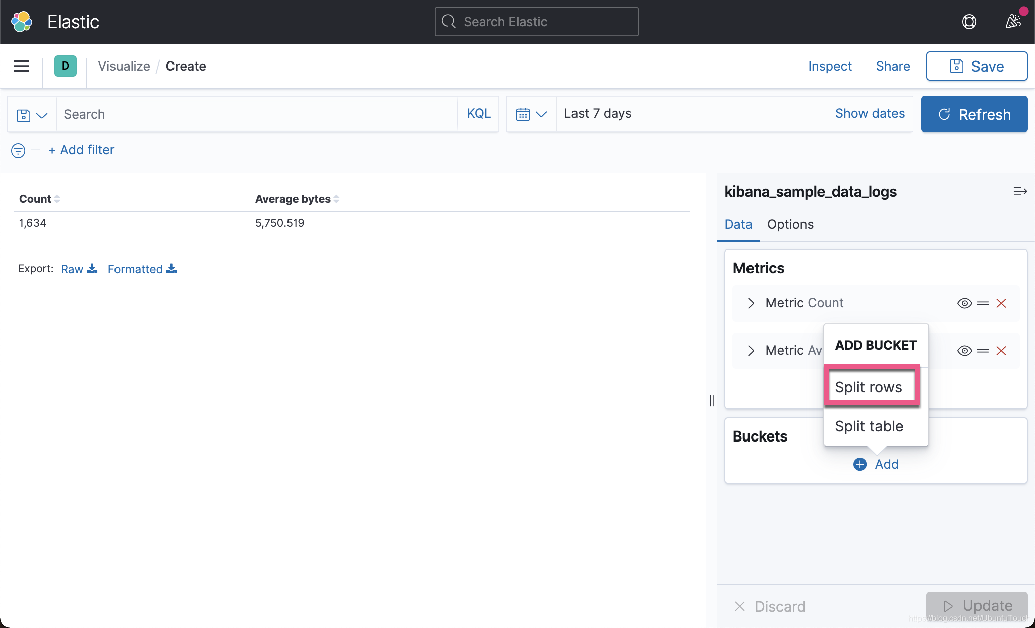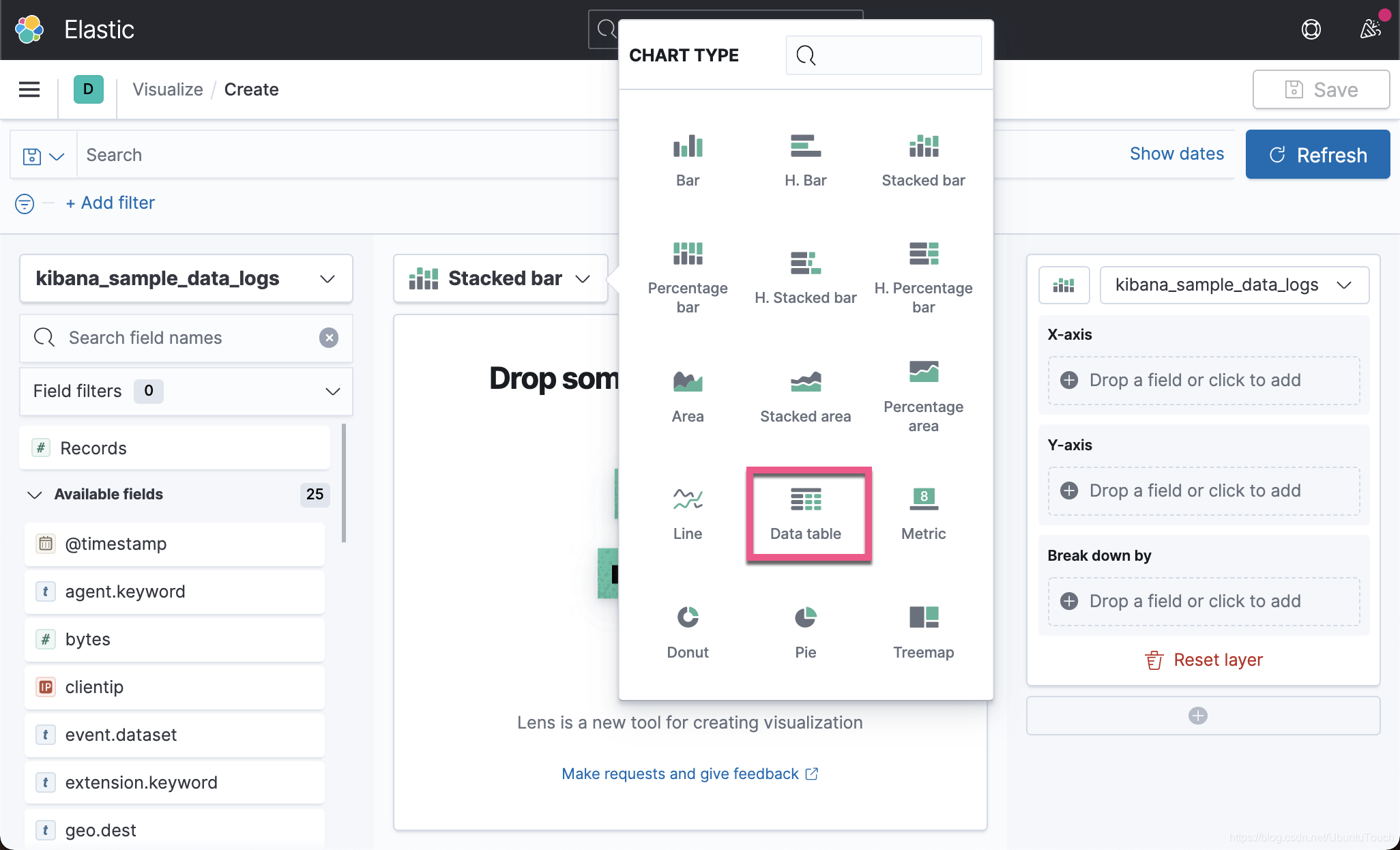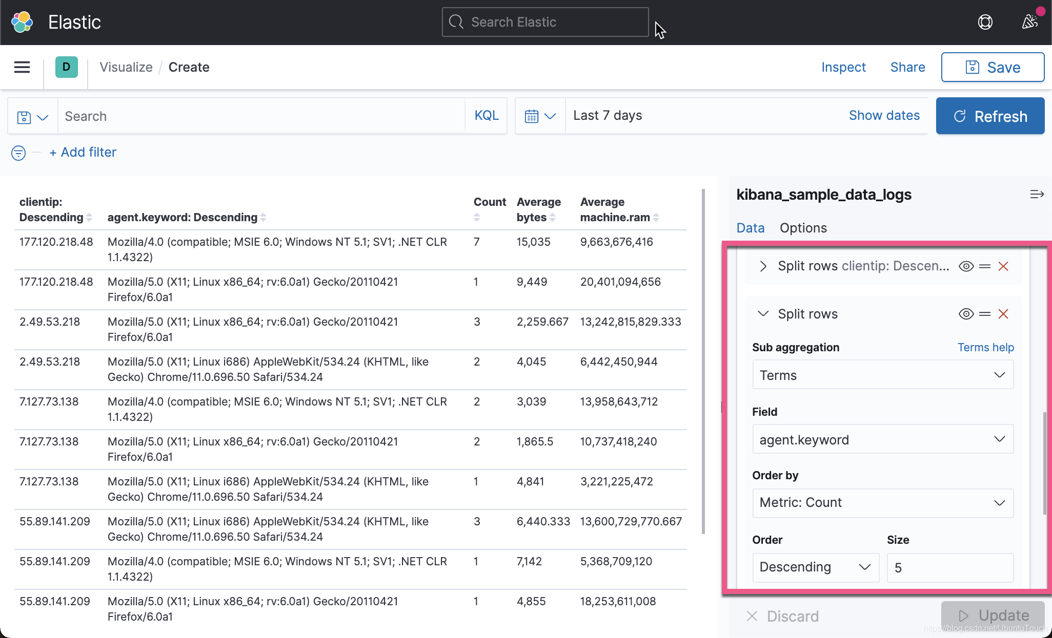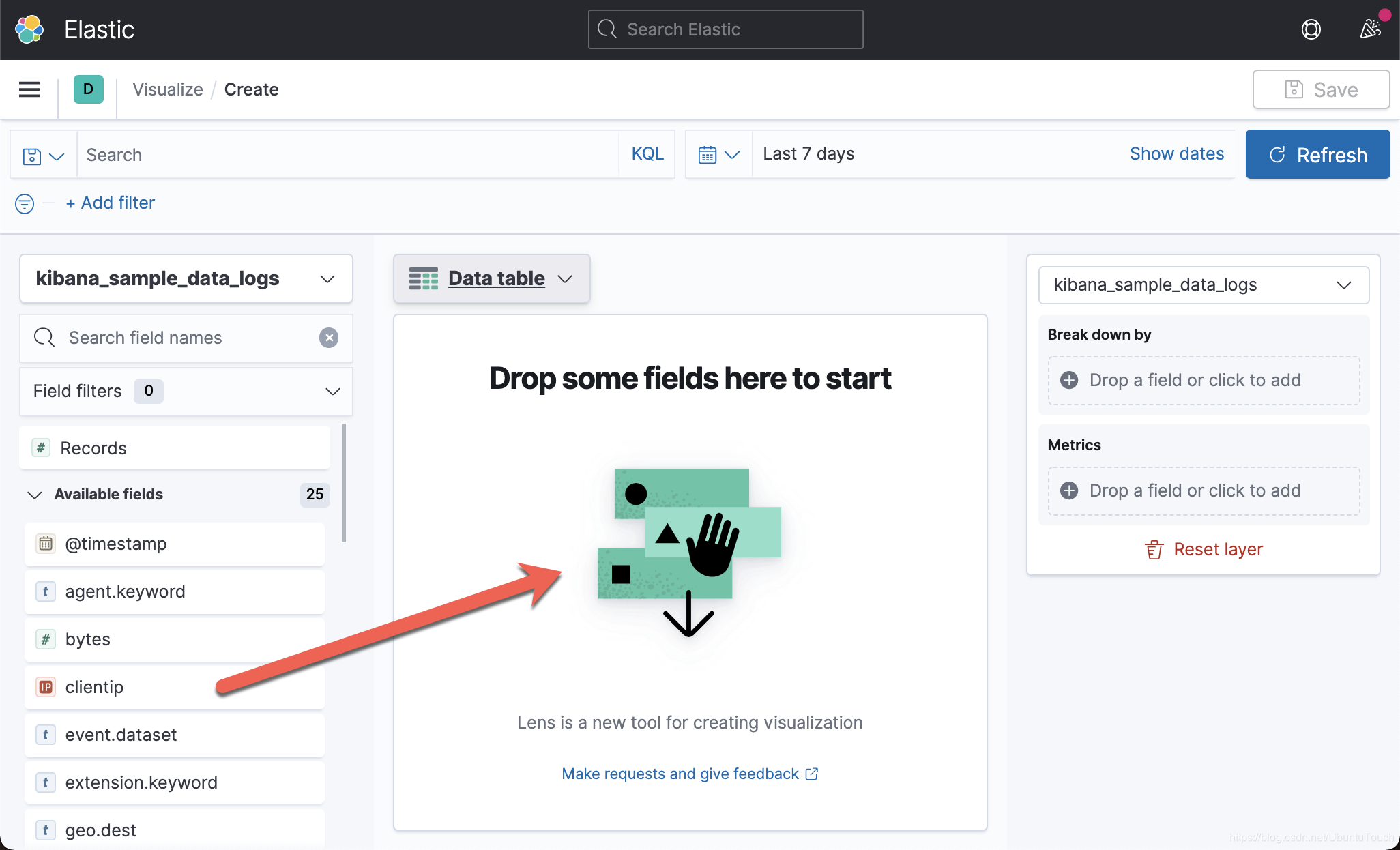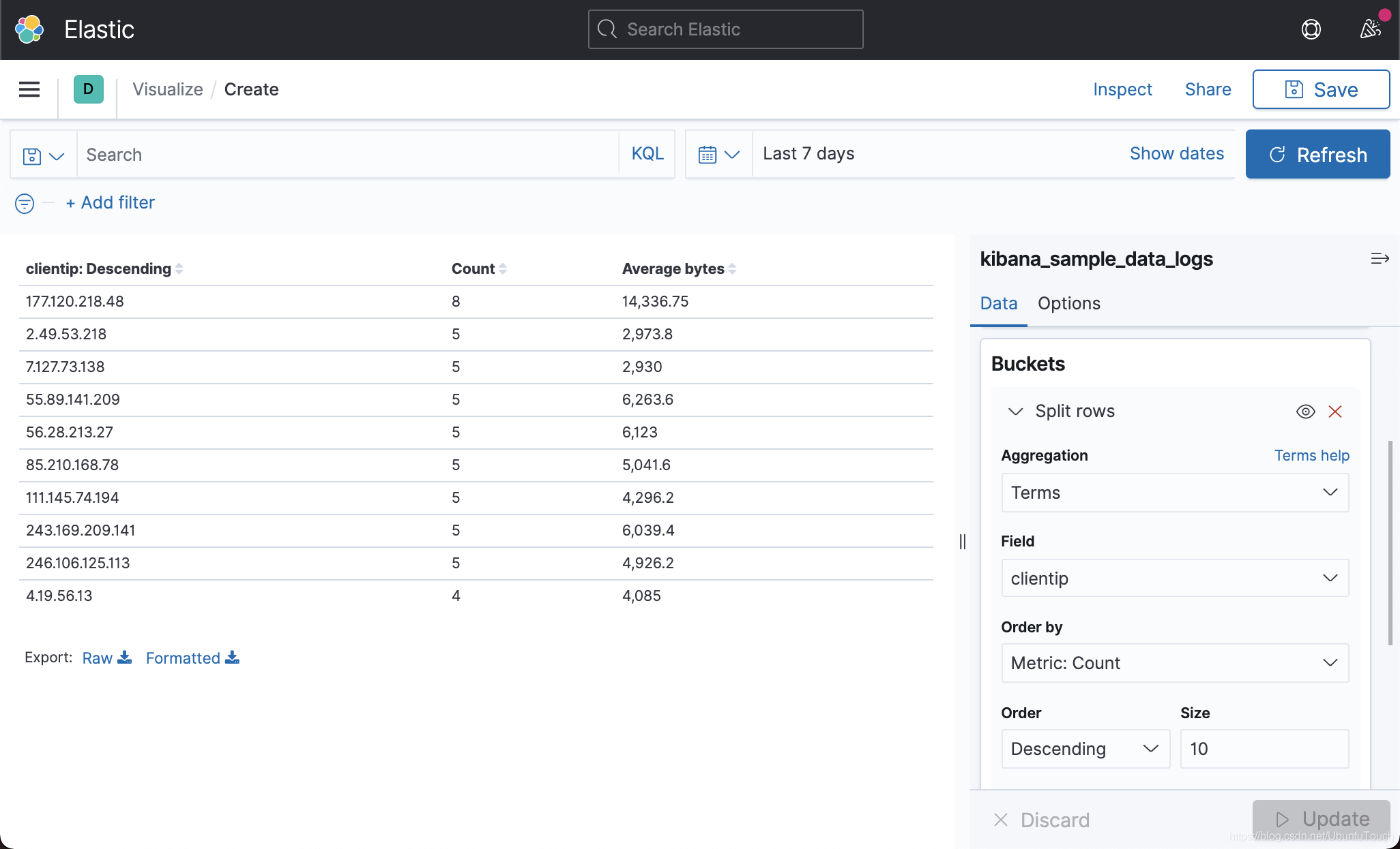 > 本文由 [简悦 SimpRead](http://ksria.com/simpread/) 转码, 原文地址 [blog.csdn.net](https://blog.csdn.net/UbuntuTouch/article/details/111088189) 在 Kibana 的[可视化](https://so.csdn.net/so/search?q=%E5%8F%AF%E8%A7%86%E5%8C%96&spm=1001.2101.3001.7020)中,我们经常会绘制表格。我总结了一下,有如下的四种方法: 1. 在 Discover 界面中制作 2. 使用 table 可视化进行制作 3. 使用 TSVB 来制作 4. 使用 Lens 进行制作 在这几种方式中,几种制作最后的结果是不一样的。我们在实际的使用中,需要根据自己的需求来分别进行选择。 准备数据 ==== 在今天的实验中,我将使用 Kibana 自带的数据来进行演示。我将以 Elastic Stack 7.10 来进行展示:    这样我们就完成了一个叫做 kibana_sample_data_logs 的索引导入。在接下来的练习中,我们将使用这个索引来进行展示。 使用 Discover 界面来制作 table ======================= 我们先打开 Kibana discover 界面:   我们选择 kibana_sample_data_logs 索引模式,然后选择相应的时间 time picker 来展示数据。我们在左边选择相应的字段:  按照同样的方法,我们添加其它的字段,比如 clientip, bytes 以及 agent。最终我们形成如下的表格:  我们点击上面的 Save 链接,并保存当前的可视化图。  我们可以从上面表格中可以看出来:在表格的左边有一个时间戳,我们甚至可以直接点击 **>** 来进行展开这个文档的细节:  这类的表格在 Dashboard 中可以帮我们查找每个文档的详细的内容。我们也可以突出相应的字段在表格中。这个表格最终可以被 Dashboard 所使用:     从上面,我们可以看出来。我们把之前的 table 直接插入到 Dashboard 中了。我们可以点击每个项的 **>** 来进行展开。 使用 table 可视化来进行制作 ================= 我们打开 Visualization:     在默认的情况下,它显示文档的总数。从上面的 Add 中,我们可以看出来,它只可以添加 Metric 也就是指标。从某种意义上讲,这类表格只能制作一些 Pivot 表格,也就透视图。它是对数据进行聚合而形成的表格。我们可以添加一些指标:  在上面,我们添加了一个 bytes 的平均值。 我们接下来增加一些 row,也就是一些行:   点击上面的 Update 按钮:  这样就形成了如上所示的 table。我们可以按照上面的方法来添加更多的指标进入这个 table:  就想我之前所说的那样。这类表格就是一个透视图。当然我们也可以更进一步来对表格添加 row:  使用 TSVB 来制作表格 ============= 关于这个表格的制作,它和上面的使用 table 可视化制作基本相同。这个在我之前的文章 “[Kibana:使用 TSVB table 来定制表格](https://elasticstack.blog.csdn.net/article/details/109384886)” 中已经有所介绍。这类表格的好处是它可以定制背景颜色以及对每个 column 的颜色进行定制。当一个 column 里的值大于一个值时可以显示一个颜色,否则用另外一个颜色进行显示。  这个在很多的时候非常有用。 在 Lens 里展示 table ================ 在 Lens 里我们也可以制作 table。它的制作非常简单。我们甚至可以通过拖拽的方式来完成:      通过拖拽 clientip 到中央的可视化显示区:  按照同样的方法,我们可以拖拽更多的字段到表格中:  在上面我们添加了 agent 到表格中。在这个可视化中,至少有一个列是指标。在上面我们显示的是 average bytes,也就是 bytes 的平均值。当然我们可以添加更多的其它指标到这个表格中,比如:  通过拖拽 machine.ram 到右边的 Drop a field or click to add:  我们可以点击 Average of machine.ram 来对这个指标进行定制:  总结 == 在今天的练习中,我展示了 4 种制作表格的方法。每个方法都有自己的特点。在实际的使用中,根据自己的喜好来分别进行选择。
