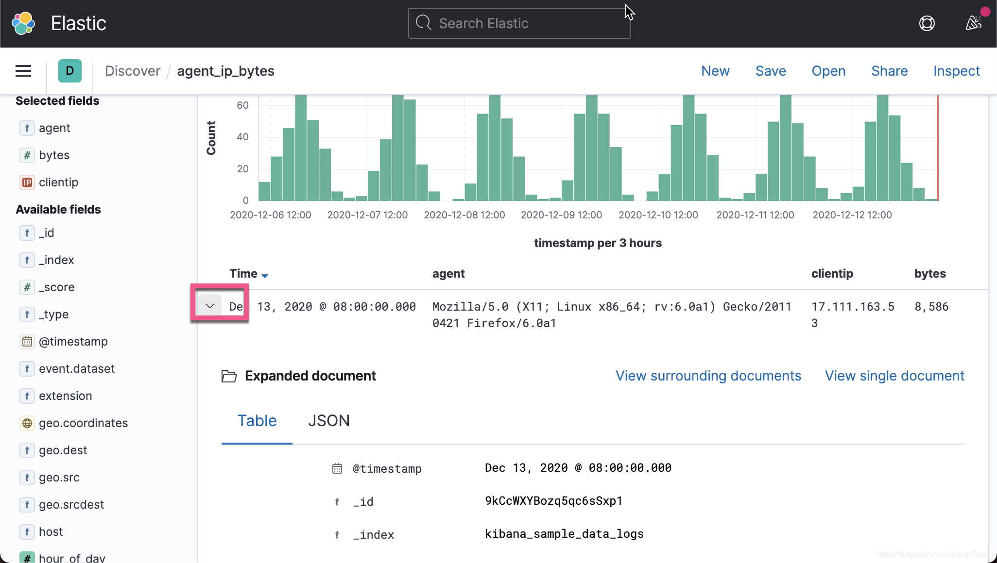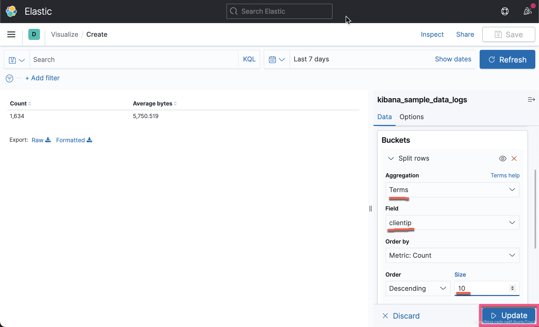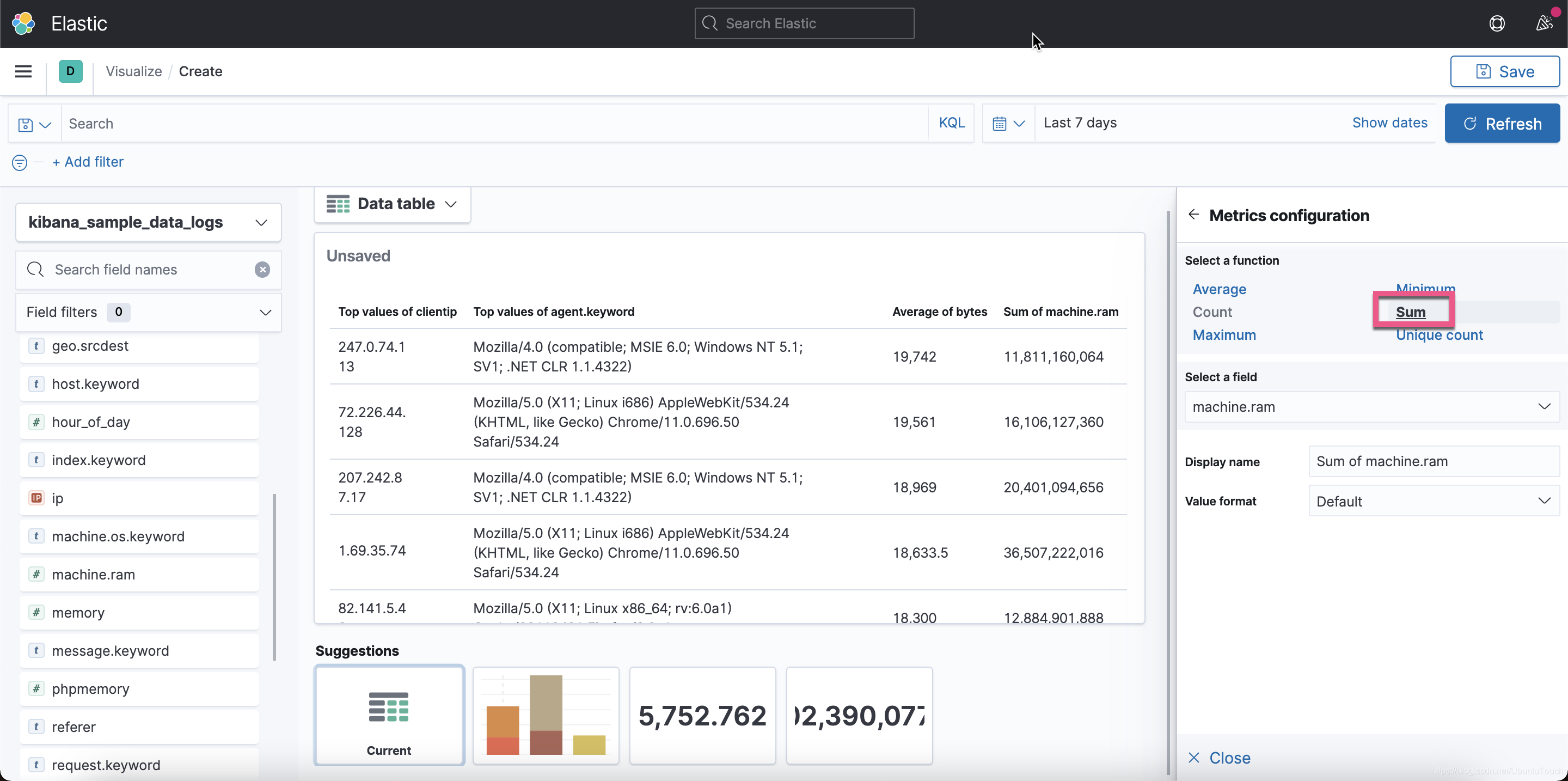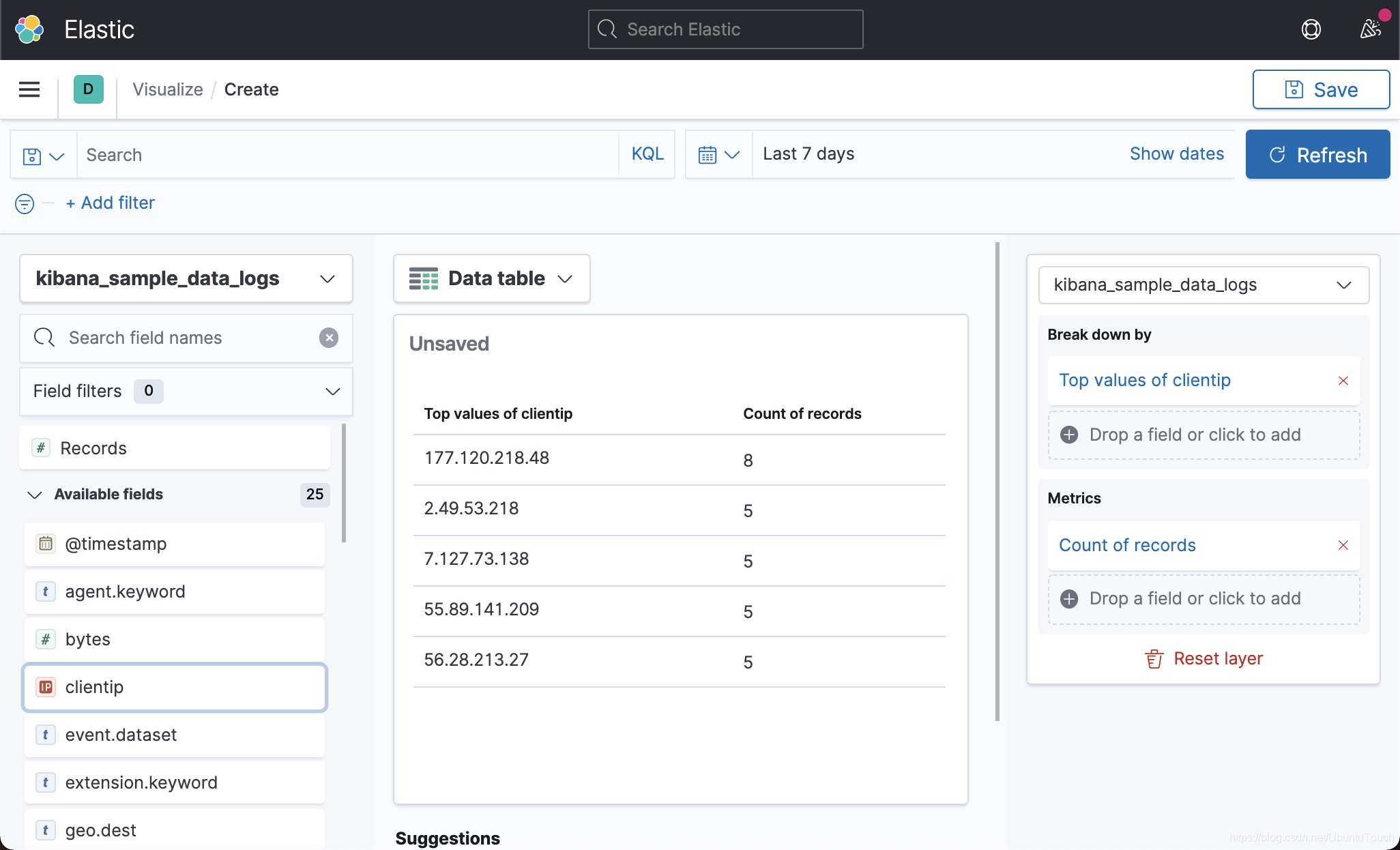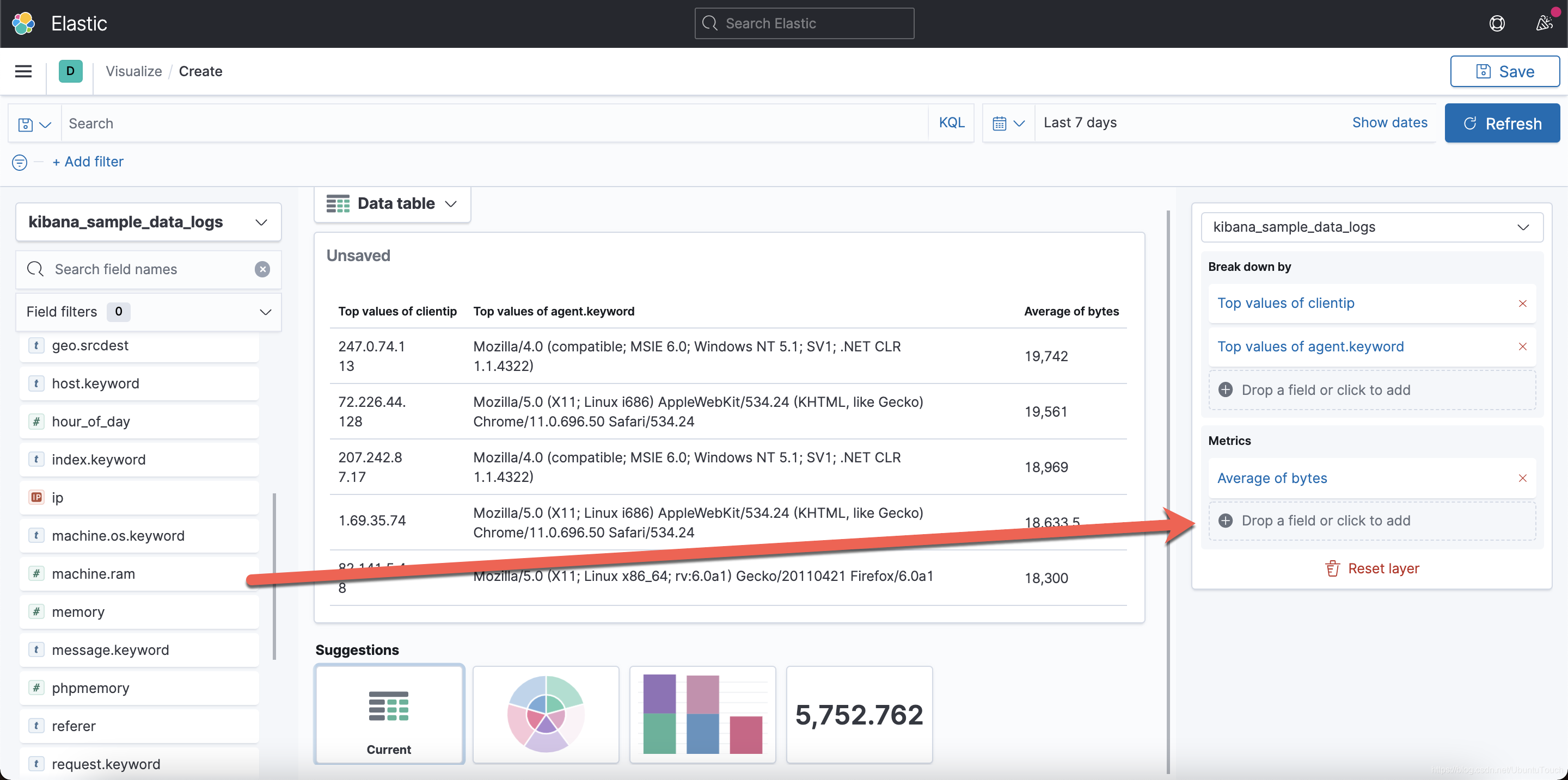 > 本文由 [简悦 SimpRead](http://ksria.com/simpread/) 转码, 原文地址 [blog.csdn.net](https://blog.csdn.net/UbuntuTouch/article/details/111088189) 在 Kibana 的[可视化](https://so.csdn.net/so/search?q=%E5%8F%AF%E8%A7%86%E5%8C%96&spm=1001.2101.3001.7020)中,我们经常会绘制表格。我总结了一下,有如下的四种方法: 1. 在 Discover 界面中制作 2. 使用 table 可视化进行制作 3. 使用 TSVB 来制作 4. 使用 Lens 进行制作 在这几种方式中,几种制作最后的结果是不一样的。我们在实际的使用中,需要根据自己的需求来分别进行选择。 准备数据 ==== 在今天的实验中,我将使用 Kibana 自带的数据来进行演示。我将以 Elastic Stack 7.10 来进行展示:    这样我们就完成了一个叫做 kibana_sample_data_logs 的索引导入。在接下来的练习中,我们将使用这个索引来进行展示。 使用 Discover 界面来制作 table ======================= 我们先打开 Kibana discover 界面:   我们选择 kibana_sample_data_logs 索引模式,然后选择相应的时间 time picker 来展示数据。我们在左边选择相应的字段:  按照同样的方法,我们添加其它的字段,比如 clientip, bytes 以及 agent。最终我们形成如下的表格:  我们点击上面的 Save 链接,并保存当前的可视化图。  我们可以从上面表格中可以看出来:在表格的左边有一个时间戳,我们甚至可以直接点击 **>** 来进行展开这个文档的细节:  这类的表格在 Dashboard 中可以帮我们查找每个文档的详细的内容。我们也可以突出相应的字段在表格中。这个表格最终可以被 Dashboard 所使用:     从上面,我们可以看出来。我们把之前的 table 直接插入到 Dashboard 中了。我们可以点击每个项的 **>** 来进行展开。 使用 table 可视化来进行制作 ================= 我们打开 Visualization:     在默认的情况下,它显示文档的总数。从上面的 Add 中,我们可以看出来,它只可以添加 Metric 也就是指标。从某种意义上讲,这类表格只能制作一些 Pivot 表格,也就透视图。它是对数据进行聚合而形成的表格。我们可以添加一些指标:  在上面,我们添加了一个 bytes 的平均值。 我们接下来增加一些 row,也就是一些行:   点击上面的 Update 按钮:  这样就形成了如上所示的 table。我们可以按照上面的方法来添加更多的指标进入这个 table:  就想我之前所说的那样。这类表格就是一个透视图。当然我们也可以更进一步来对表格添加 row:  使用 TSVB 来制作表格 ============= 关于这个表格的制作,它和上面的使用 table 可视化制作基本相同。这个在我之前的文章 “[Kibana:使用 TSVB table 来定制表格](https://elasticstack.blog.csdn.net/article/details/109384886)” 中已经有所介绍。这类表格的好处是它可以定制背景颜色以及对每个 column 的颜色进行定制。当一个 column 里的值大于一个值时可以显示一个颜色,否则用另外一个颜色进行显示。  这个在很多的时候非常有用。 在 Lens 里展示 table ================ 在 Lens 里我们也可以制作 table。它的制作非常简单。我们甚至可以通过拖拽的方式来完成:      通过拖拽 clientip 到中央的可视化显示区:  按照同样的方法,我们可以拖拽更多的字段到表格中:  在上面我们添加了 agent 到表格中。在这个可视化中,至少有一个列是指标。在上面我们显示的是 average bytes,也就是 bytes 的平均值。当然我们可以添加更多的其它指标到这个表格中,比如:  通过拖拽 machine.ram 到右边的 Drop a field or click to add:  我们可以点击 Average of machine.ram 来对这个指标进行定制:  总结 == 在今天的练习中,我展示了 4 种制作表格的方法。每个方法都有自己的特点。在实际的使用中,根据自己的喜好来分别进行选择。