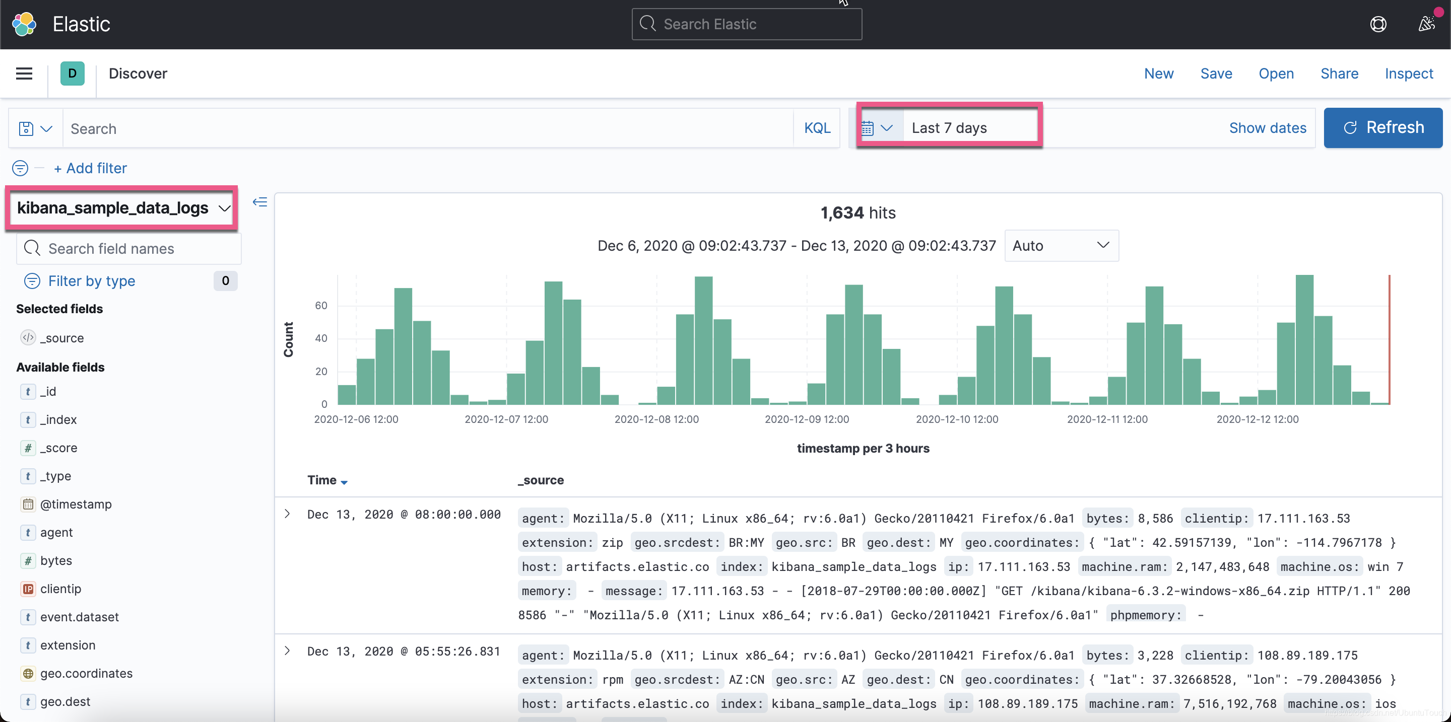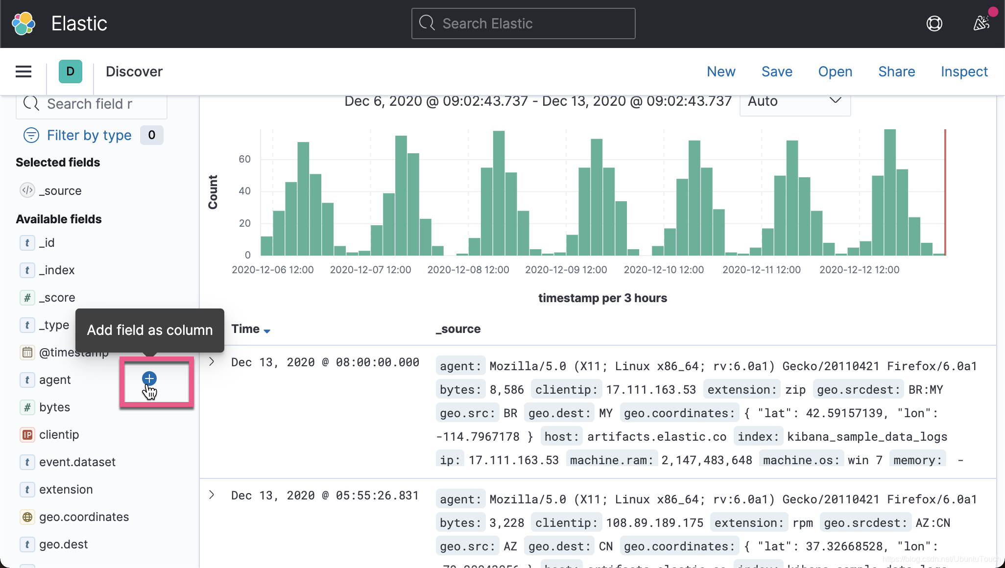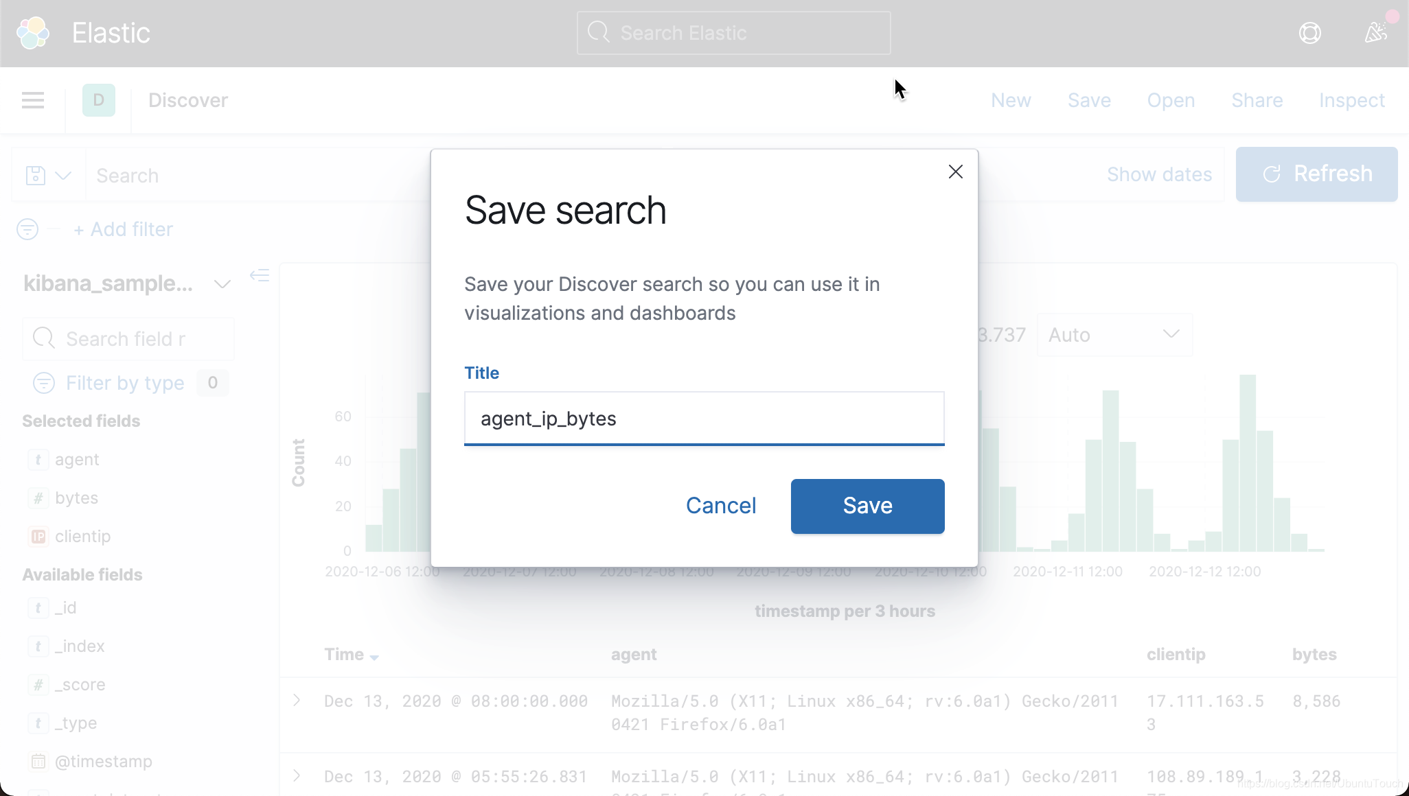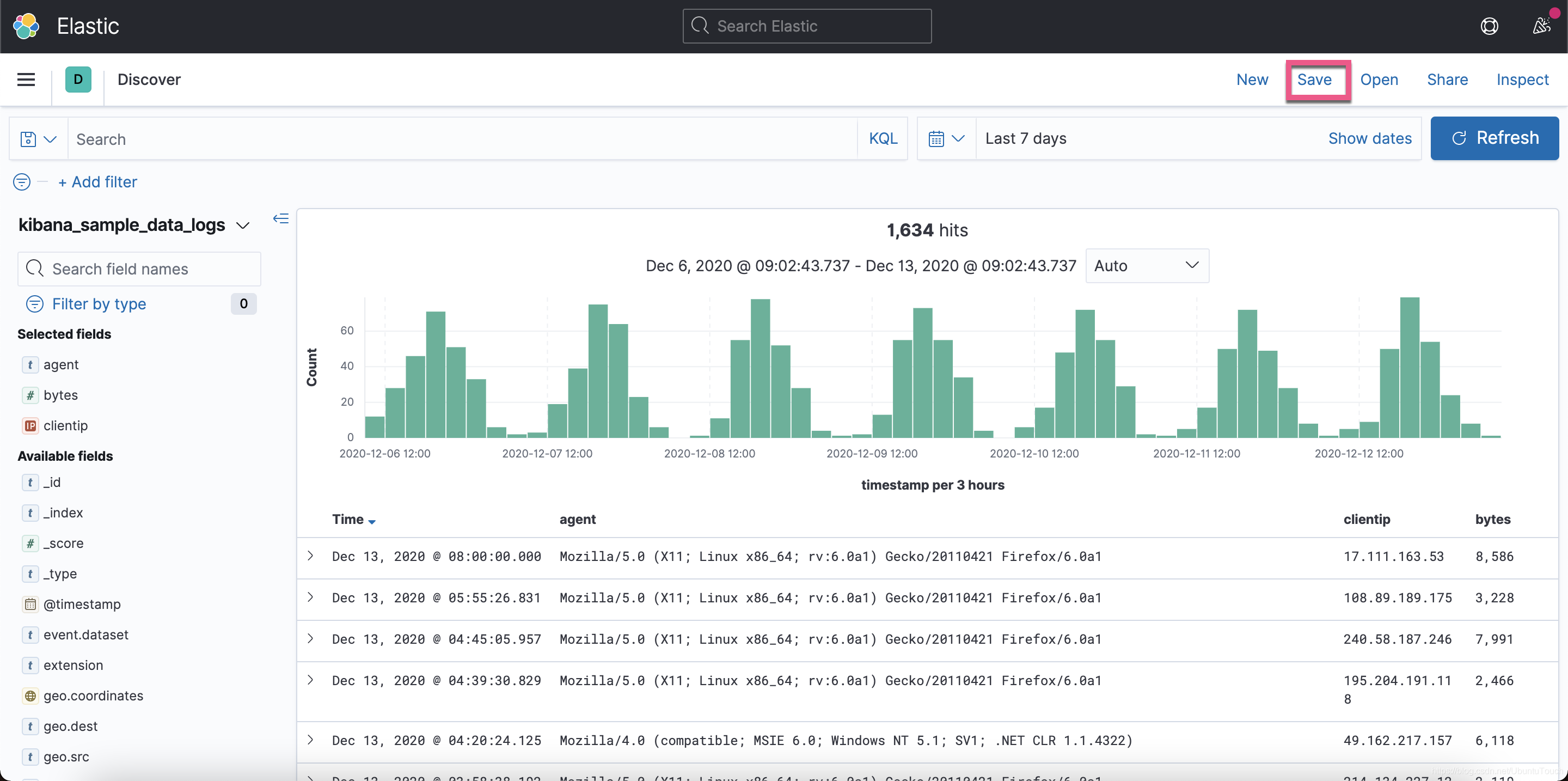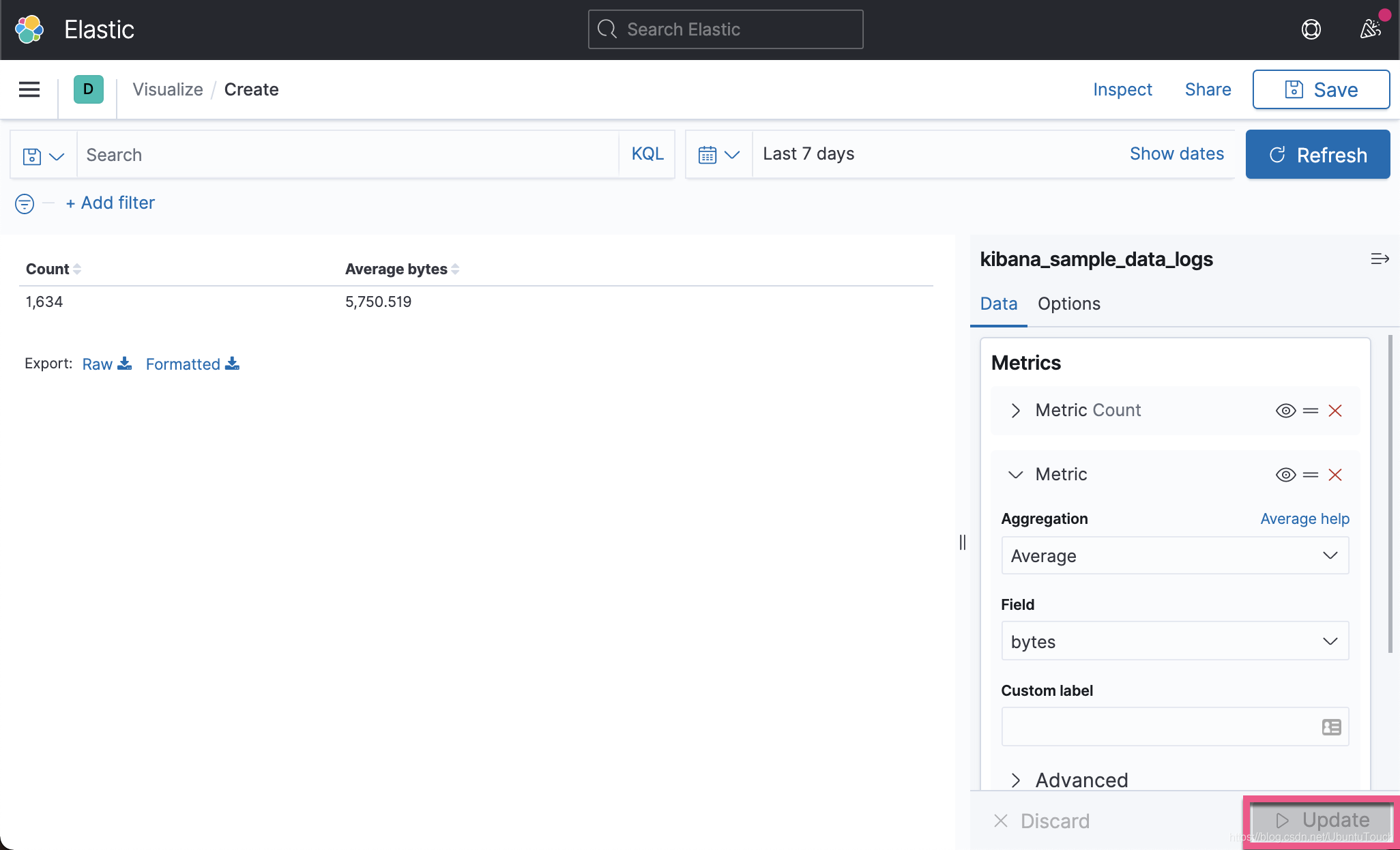 > 本文由 [简悦 SimpRead](http://ksria.com/simpread/) 转码, 原文地址 [blog.csdn.net](https://blog.csdn.net/UbuntuTouch/article/details/111088189) 在 Kibana 的[可视化](https://so.csdn.net/so/search?q=%E5%8F%AF%E8%A7%86%E5%8C%96&spm=1001.2101.3001.7020)中,我们经常会绘制表格。我总结了一下,有如下的四种方法: 1. 在 Discover 界面中制作 2. 使用 table 可视化进行制作 3. 使用 TSVB 来制作 4. 使用 Lens 进行制作 在这几种方式中,几种制作最后的结果是不一样的。我们在实际的使用中,需要根据自己的需求来分别进行选择。 准备数据 ==== 在今天的实验中,我将使用 Kibana 自带的数据来进行演示。我将以 Elastic Stack 7.10 来进行展示:    这样我们就完成了一个叫做 kibana_sample_data_logs 的索引导入。在接下来的练习中,我们将使用这个索引来进行展示。 使用 Discover 界面来制作 table ======================= 我们先打开 Kibana discover 界面:   我们选择 kibana_sample_data_logs 索引模式,然后选择相应的时间 time picker 来展示数据。我们在左边选择相应的字段:  按照同样的方法,我们添加其它的字段,比如 clientip, bytes 以及 agent。最终我们形成如下的表格:  我们点击上面的 Save 链接,并保存当前的可视化图。  我们可以从上面表格中可以看出来:在表格的左边有一个时间戳,我们甚至可以直接点击 **>** 来进行展开这个文档的细节:  这类的表格在 Dashboard 中可以帮我们查找每个文档的详细的内容。我们也可以突出相应的字段在表格中。这个表格最终可以被 Dashboard 所使用:     从上面,我们可以看出来。我们把之前的 table 直接插入到 Dashboard 中了。我们可以点击每个项的 **>** 来进行展开。 使用 table 可视化来进行制作 ================= 我们打开 Visualization:     在默认的情况下,它显示文档的总数。从上面的 Add 中,我们可以看出来,它只可以添加 Metric 也就是指标。从某种意义上讲,这类表格只能制作一些 Pivot 表格,也就透视图。它是对数据进行聚合而形成的表格。我们可以添加一些指标:  在上面,我们添加了一个 bytes 的平均值。 我们接下来增加一些 row,也就是一些行:   点击上面的 Update 按钮:  这样就形成了如上所示的 table。我们可以按照上面的方法来添加更多的指标进入这个 table:  就想我之前所说的那样。这类表格就是一个透视图。当然我们也可以更进一步来对表格添加 row:  使用 TSVB 来制作表格 ============= 关于这个表格的制作,它和上面的使用 table 可视化制作基本相同。这个在我之前的文章 “[Kibana:使用 TSVB table 来定制表格](https://elasticstack.blog.csdn.net/article/details/109384886)” 中已经有所介绍。这类表格的好处是它可以定制背景颜色以及对每个 column 的颜色进行定制。当一个 column 里的值大于一个值时可以显示一个颜色,否则用另外一个颜色进行显示。  这个在很多的时候非常有用。 在 Lens 里展示 table ================ 在 Lens 里我们也可以制作 table。它的制作非常简单。我们甚至可以通过拖拽的方式来完成:      通过拖拽 clientip 到中央的可视化显示区:  按照同样的方法,我们可以拖拽更多的字段到表格中:  在上面我们添加了 agent 到表格中。在这个可视化中,至少有一个列是指标。在上面我们显示的是 average bytes,也就是 bytes 的平均值。当然我们可以添加更多的其它指标到这个表格中,比如:  通过拖拽 machine.ram 到右边的 Drop a field or click to add:  我们可以点击 Average of machine.ram 来对这个指标进行定制:  总结 == 在今天的练习中,我展示了 4 种制作表格的方法。每个方法都有自己的特点。在实际的使用中,根据自己的喜好来分别进行选择。