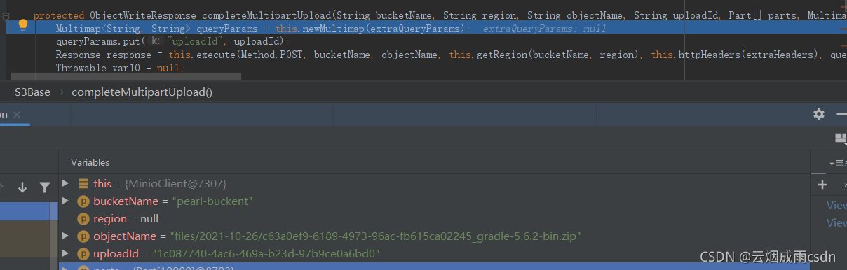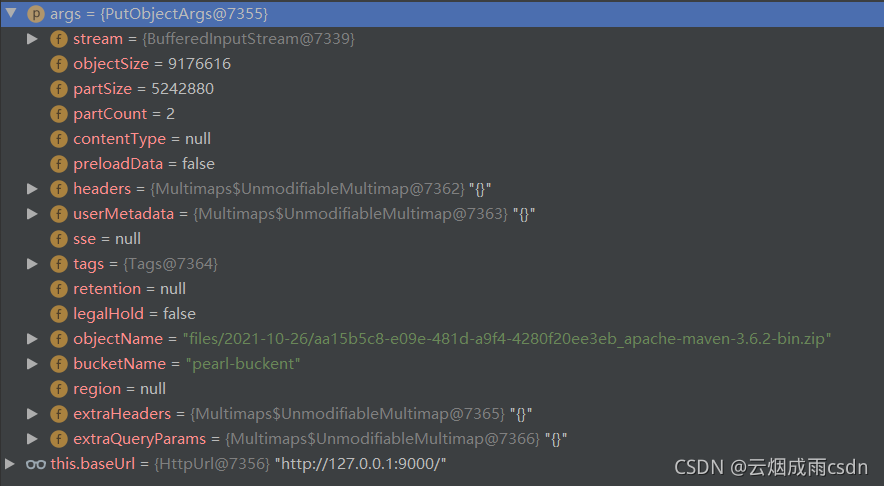 > 本文由 [简悦 SimpRead](http://ksria.com/simpread/) 转码, 原文地址 [blog.csdn.net](https://blog.csdn.net/qq_43437874/article/details/120968543) 前言 -- 为了更好的理解和优化 [Minio](https://so.csdn.net/so/search?q=Minio&spm=1001.2101.3001.7020) 文件上传,本篇文档对 MInio 中上传文件 putObject 接口源码分析以下。 基于 [Java 客户端 API](https://docs.min.io/docs/java-client-api-reference.html) Controller 层上传文件接口: ``` @PostMapping("/upload") @ResponseBody public Object upload(MultipartFile file, String bucketName) throws IOException { return minioTemplate.putObject(file.getInputStream(), bucketName, file.getOriginalFilename()); } ``` MinioTemplate 接口: ``` minioClient.putObject( PutObjectArgs.builder().bucket(bucketName).object(uuidFileName).stream( inputStream, inputStream.available(), -1) .build()); ``` [源码](https://so.csdn.net/so/search?q=%E6%BA%90%E7%A0%81&spm=1001.2101.3001.7020)分析 ---------------------------------------------------------------------------------- ### 1. 进入 Controller 层接口 首先我在页面上上传了一个 9M 左右的文件:  文件上传,经过 Tomcat 服务器进行处理,然后到达我们的 Controller 层上传文件接口,我们使用的是 [MultipartFile](https://so.csdn.net/so/search?q=MultipartFile&spm=1001.2101.3001.7020) 对象来接受文件,可以看到当前 MultipartFile 对象存放了文件相关信息,而此时实际的文件是由 Tomcat 存放在硬盘临时目录的。 MultipartFile 实际的对象是 StandardMultipartHttpServletRequest 的实例,他包含了 ApplicationPart 对象,ApplicationPart 包含了图片中的文件信息。  接收到对象后,调用的就是 MinioTemplate,这里传入了各种参数: ``` minioTemplate.putObject(file.getInputStream(), bucketName, file.getOriginalFilename()); ``` 最重要的是传入了一个 InputStream,调用的是 MultipartFile 对象的 getInputStream() 方法。 getInputStream 获取输入流,是调用 ApplicationPart 中的 DiskFileItem 对象的 getInputStream() 方法。这个方法会将临时文件,直接转为 FileInputStream 并返回。 ``` public InputStream getInputStream() throws IOException { if (!this.isInMemory()) { // 直接将临时文件转为输入流 return new FileInputStream(this.dfos.getFile()); } else { if (this.cachedContent == null) { this.cachedContent = this.dfos.getData(); } return new ByteArrayInputStream(this.cachedContent); } } ``` ### 2. 构建参数对象 PutObjectArgs(参数校验,分片) InputStream 获取到了以后,接着就是调用 MinioTemplate 中的 putObject 方法了。 ``` minioClient.putObject( PutObjectArgs.builder().bucket(bucketName).object(uuidFileName).stream( inputStream, inputStream.available(), -1) .build()); ``` putObject 方法实际调用的就是 MinioClient 的 putObject,调用之前会创建 PutObjectArgs 参数对象,使用的是建造者模式。 PutObjectArgs 首先会对存储桶名称进行校验,所以创建存储桶名称时,要格外注意。 ``` protected void validateBucketName(String name) { // 非空校验 this.validateNotNull(name, "bucket name"); // 1. 校验长度,3-63之间 if (name.length() >= 3 && name.length() <= 63) { String msg; // 2. 不能包含“..” if (name.contains("..")) { msg = "bucket name cannot contain successive periods. For more information refer http://docs.aws.amazon.com/AmazonS3/latest/dev/BucketRestrictions.html"; throw new IllegalArgumentException(name + " : " + msg); // 3. 正则校验 } else if (!name.matches("^[a-z0-9][a-z0-9\\.\\-]+[a-z0-9]$")) { msg = "bucket name does not follow Amazon S3 standards. For more information refer http://docs.aws.amazon.com/AmazonS3/latest/dev/BucketRestrictions.html"; throw new IllegalArgumentException(name + " : " + msg); } } else { throw new IllegalArgumentException(name + " : bucket name must be at least 3 and no more than 63 characters long"); } } ``` 然后对对象名称进行校验: ``` protected void validateObjectName(String name) { // 1. 非空和Null校验 this.validateNotEmptyString(name, "object name"); String[] var2 = name.split("/"); // 按照反斜杠分割为字符串数组 int var3 = var2.length; // 2. 循环字符串数组,校验每个斜杠分割的字段不能是“.”或者“..” for(int var4 = 0; var4 < var3; ++var4) { String token = var2[var4]; if (token.equals(".") || token.equals("..")) { throw new IllegalArgumentException("object name with '.' or '..' path segment is not supported"); } } } ``` 最后对 InputStream 进行构建。 ``` public PutObjectArgs.Builder stream(InputStream stream, long objectSize, long partSize) { // 1. 非空 this.validateNotNull(stream, "stream"); // 2. 获取分片数,5M分割 long[] partinfo = this.getPartInfo(objectSize, partSize); long pSize = partinfo[0]; // 分片大小 5M=5242880字节 int pCount = (int)partinfo[1]; // 分片数,这里上传的9m文件,所以有两片 // 3. 将FileInputStream=》BufferedInputStream BufferedInputStream bis = stream instanceof BufferedInputStream ? (BufferedInputStream)stream : new BufferedInputStream(stream); // 4. 将这些参数添加到PutObjectArgs对象中 return this.setStream(bis, objectSize, pSize, pCount); } ``` 在构建 InputStream 时,会进行分片操作,我们可以了解到上传文件大小的一些限制: * 分片大小不能小于 5MB,大于 5GB * 对象大小不能超过 5TiB * partSize 传入 - 1,默认按照 5MB 进行分割 * 分片数量不能超过 10000 分片规则如下: ``` // 参数为 文件大小objectSize、分片大小partSize,分片数我们传入的是-1,表示使用默认配置 protected long[] getPartInfo(long objectSize, long partSize) { // 1. 校验大小,如果设置的分片大小 小于5M或者大于5GB,报错不支持 // 对象大小超过5TiB,报错不支持 this.validateSizes(objectSize, partSize); if (objectSize < 0L) { return new long[]{partSize, -1L}; } else { // 2. 没有设置分片数据大小,怎按照默认的5M进行分割 if (partS